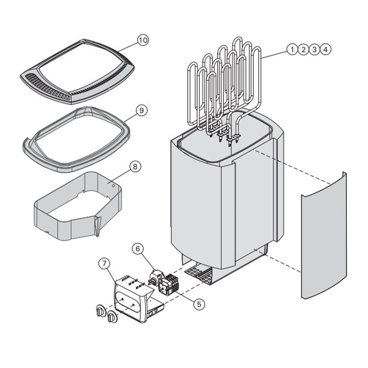 Máy xông hơi khô vỏ thường được làm từ sắt sơn tĩnh điện hoặc inox không gỉ. Giúp bảo vệ hệ thống bên trong cũng như phòng tránh những nguy hiểm cho người sử dụng. Bảng vi mạch xử lý: là trung gian giúp con người điều khiển vận hành máy xông theo từng chế độ khác nhau. Dây điện trở (mayso) là bộ phận giúp máy xông khô tạo nhiệt làm nóng những viên đá sauna. Có thể tăng giảm nhiệt độ dây mayso bằng thao tác trên bảng điều khiển của thiết bị.