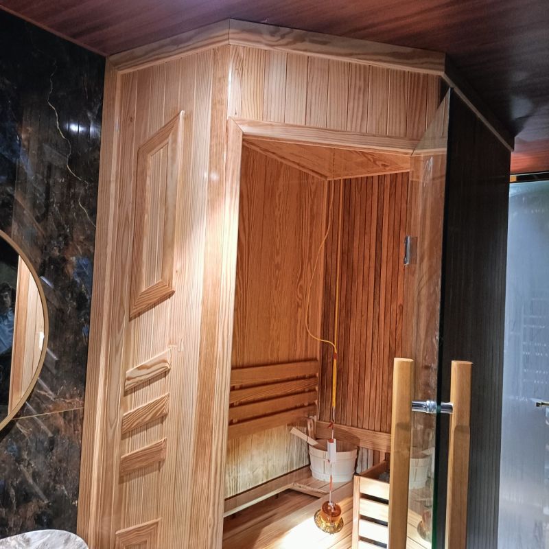 - Chất liệu: Bằng gỗ hoặc kính chuyên dụng cho phòng xông hơi khô. Đã qua xử lý chống cong, vênh, mối mọt - Máy xông hơi ướt chuyên dụng như: Amazon, Coast, Aleko, sawo... - Phụ kiện: Đá sauna, xô gáo gỗ, đèn chống nổ, ẩm kế đo nhiệt độ thời gian, bát inox đựng tinh dầu, kết hợp vách đá muối himmalaya...
