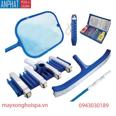 Thiết bị vệ sinh bể bơi là dụng cụ dùng để làm vệ sinh bể bơi như vợt rác, chổi cọ, bàn hút, cuộn dây hút và sào nhôm để đẩy.