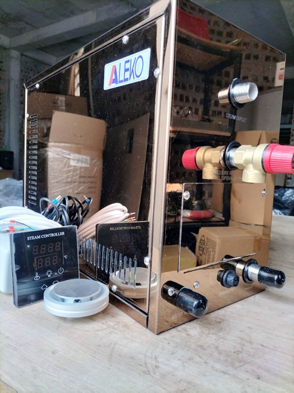 Máy xông hơi ướt Aleko thương hiệu máy xông hơi được sản xuất trên dây truyền công nghệ của Mỹ với ưu điểm nổi bật về độ bền và tốc độ ra hơi cũng như độ an toàn. Toàn bộ thân vỏ máy, khung và các hệ thống ống được thiết kế bằng chất liệu thép không gỉ, dày dặn, chắc chắn mang đến sản phẩm chất lượng giá tốt. Với 3 model ALEKO AL, ALEKO AL_X, ALEKO AT_S thông dụng. Model AL với thân vỏ máy inox chống hen gỉ và AL_X vỏ sơn tĩnh điện màu xanh, sử dụng bảng điều khiển điện tử bền bỉ. Hệ thống xả cặn cơ, sau khi tắt máy mở van xả cặn để xả nước trong bình giúp máy luôn sạch, tăng tuổi thọ và độ bền cho máy.