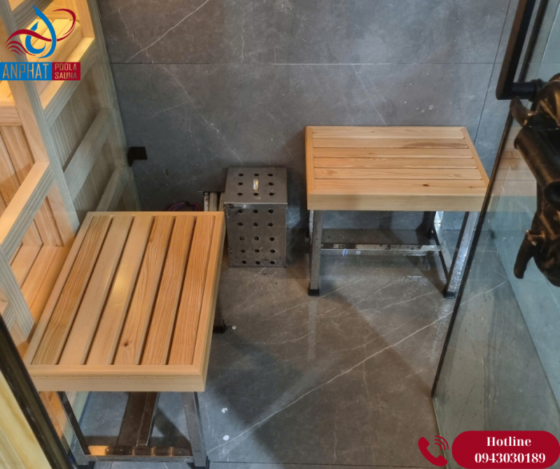 Phụ kiện trong phòng xông hơi ướt bao gồm 2 ghế gỗ khung inox thuận tiện, mang ra vào dễ dàng. Hộp đựng hương liệu bằng inox bền bỉ.