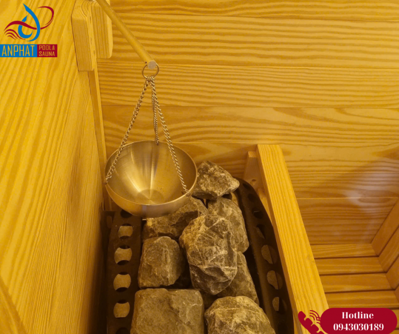 Phụ kiện phòng xông hơi khô: Anh Thanh chọn đủ bộ cho 1 phòng xông hơi khô bao gồm: Xô gáo gỗ, đá sauna chuyên dụng, đồng hồ cát, ẩm kế, bát đựng tinh dầu, đèn chống nổ.