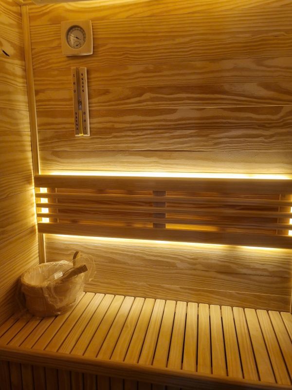 Phòng xông hơi khô gia đình anh Thanh được sử dụng toàn bộ là gỗ thông Mỹ không mắt màu ngà vàng. Gỗ đã được xử lý chống công vênh, mối mọt độ bền cao, an toàn cho người sử dụng. Với 4 vách gỗ, vách cửa được kết hợp cùng kính xường lực. Còn vách giữa được cách điệu bằng gỗ mang tính thẩm mỹ cao.