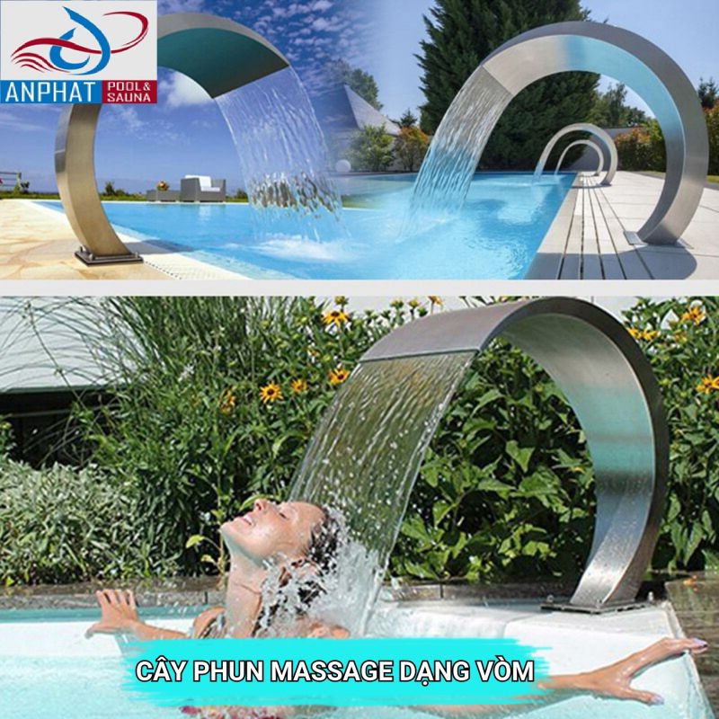 Cây phun massage dạng vòm được sản xuất bằng thép không gỉ AISI 304/316 màu bạc, phong cách hiện đại, sang trọng tạo điểm nhấn nổi bật cho hồ bơi cũng như có tác dụng massage bằng nước thú vị và tạo hiệu ứng ngoạn mục. Cây phun tạo bức màn nước với chiều rộng 300mm, 500mm, 600mm thích hợp sử dụng cho các bể bơi gia đình, bể bơi khách sạn, villa…
